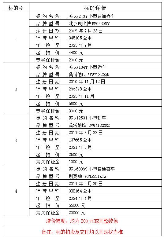 ②拍賣成交3日內(nèi)繳清成交價(jià)款、成交價(jià)5%的拍賣傭金(拍賣傭金不足500元時(shí)按500元收?。┘皹?biāo)的①、標(biāo)的②評(píng)估費(fèi)各1000元;