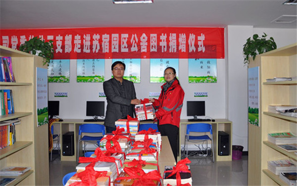 11月17日上午,蘇大教服集團黨委物業(yè)三支部陳彤彤書記一行走進園區(qū)公舍開展圖書捐贈活動,建發(fā)公司副總經(jīng)理張驥同志參加了此次活動。