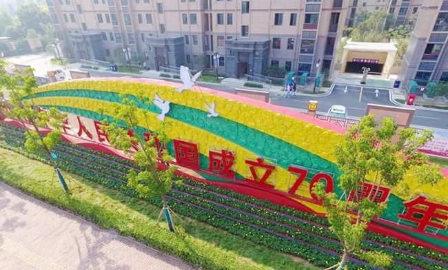 近期,走在道路上,園區(qū)居民會(huì)發(fā)現(xiàn)青海湖西路東入口南側(cè)設(shè)置一座建國(guó)70周年景觀雕塑,同時(shí)道路兩側(cè)路燈桿件懸掛國(guó)旗、中國(guó)結(jié)和70周年標(biāo)識(shí)的中國(guó)結(jié)等各式各樣的節(jié)日氛圍。