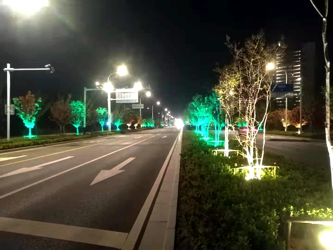 開(kāi)發(fā)公司項(xiàng)目管理過(guò)程中,重點(diǎn)把控?zé)粼搭伾?、照度及燈具造型,在燈光運(yùn)用上主要使用白、黃、綠三色,突出西湖西路城市主干道的夜景效果。在施工中,克服冬雨季施工、大氣管控和車流量大等不利因素,嚴(yán)格控制施工工藝,打造高質(zhì)量工程。夜景工程亮燈后為園區(qū)南部區(qū)域夜景增光添彩,美化了園區(qū)環(huán)境、提高了園區(qū)品位。