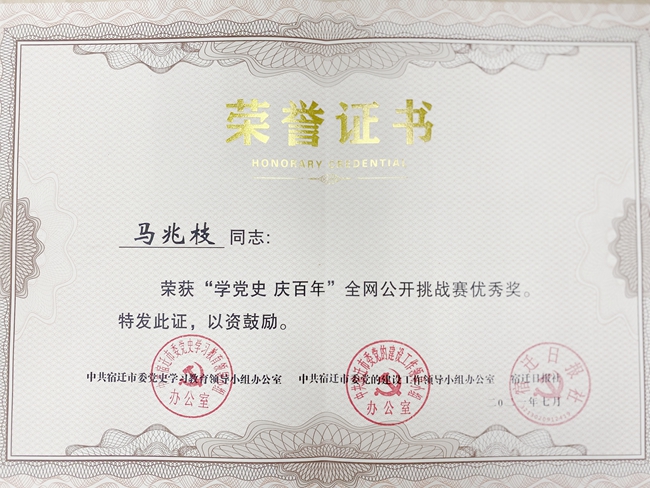 馬兆枝榮獲宿遷市“學黨史、慶百年”挑戰(zhàn)賽優(yōu)秀獎