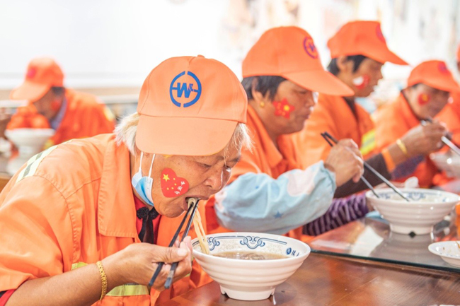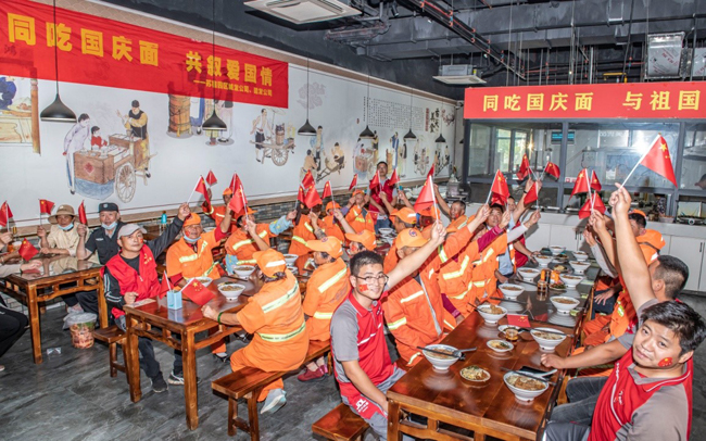 一碗“國慶面”,一份愛國情。當一碗碗熱氣騰騰、香氣撲鼻的面條送到環(huán)衛(wèi)工人、快遞小哥等堅守在一線崗位上的工作人員手中,大家接過面條,享用著寓意美好的“國慶面”,每個人的臉上都洋溢著幸福和快樂的笑容。大家用最樸素最平常的食物,表達了對祖國母親生日快樂的真摯情感。