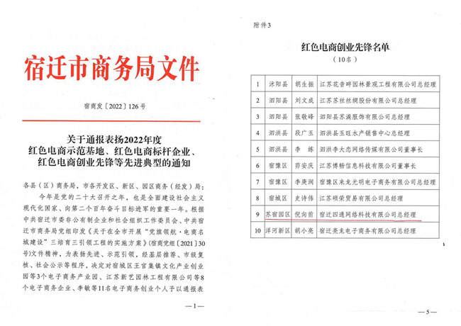 黨的二十大召開(kāi)之年,市商務(wù)局為擦亮“電商名城”牌子,激發(fā)“電商名城”發(fā)展新動(dòng)能,12月15日,組織紡織服裝產(chǎn)業(yè)鏈黨建工作暨“黨旗領(lǐng)航·電商名城建設(shè)”推進(jìn)會(huì)。園區(qū)企業(yè)家四通科技董事長(zhǎng)倪向前獲得“紅色電商創(chuàng)業(yè)先鋒”榮譽(yù)稱號(hào)。