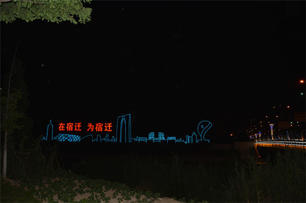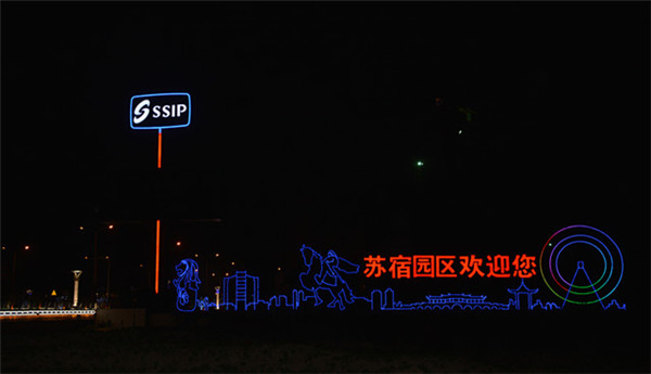 在園區(qū)東入口為民河的一畔,一座座生動的城市剪影燈光造型在青海湖西路兩側(cè)一字排開。有象征著新加坡元素的“魚尾獅”,有蘇州工業(yè)園區(qū)金雞湖畔的東方之門、摩天輪和李公堤,還有西楚霸王項羽騎馬的颯爽英姿。造型以蘇州、宿遷和新加坡城市建筑輪廓線、城市主題雕塑為基本元素,以剪影形式為載體,以現(xiàn)代高科技LED燈光為表現(xiàn)手段,通過炫麗動感的光影效果,在夜色中描繪出了一副靚麗多姿的畫卷,生動地展現(xiàn)出了園區(qū)“從新加坡到蘇州再到宿遷”和“在宿遷、為宿遷”的發(fā)展理念。