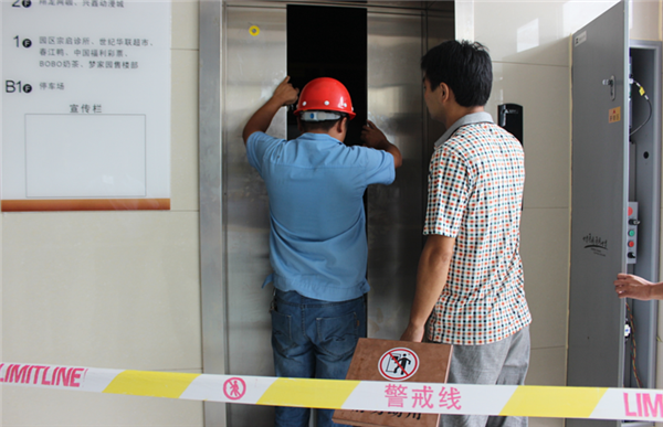 本次演練模擬在西楚金地突發(fā)的一起電梯故障困人事件而展開的應(yīng)急救援。上午9時(shí)30分,兩名乘客乘坐西楚金地1號(hào)電梯升至4層時(shí)突然遭遇電梯停電,乘客緊急按動(dòng)報(bào)警按鈕,語音向中控室反映電梯突然停梯,梯內(nèi)被困乘客兩名。中控室接到報(bào)警后,立即啟動(dòng)電梯故障困人應(yīng)急救援預(yù)案,在安撫乘客的同時(shí),迅速通知工程維修中心及維保單位。相關(guān)人員迅速兵分兩路,一路到電梯機(jī)房準(zhǔn)備盤車,平層施救;另一路到救援樓層4層準(zhǔn)備手動(dòng)打開廳門,營救轎廂內(nèi)被困乘客。從接到報(bào)警求助到救援結(jié)束,整個(gè)救援工作不到8分鐘即告成功。