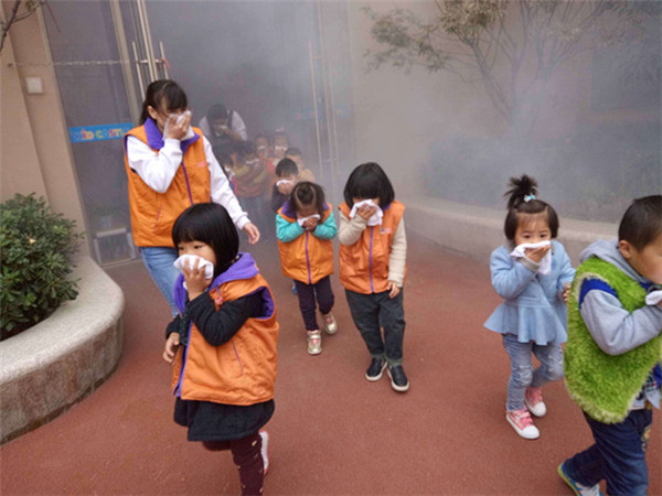 上午10點,消防演習正式開始,幼兒園里響起了緊急集合的報警聲。只見小朋友們在老師的指導下,雙手用濕毛巾捂著口鼻快速有序的從兩個樓梯和教室邊門逃生。在老師的帶領下歷時3分鐘就安全疏散到空曠的操場上,整個演練活動緊張有序。