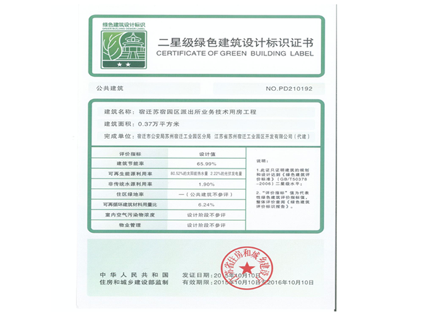 近日,由開發(fā)公司代建的蘇宿園區(qū)派出所業(yè)務(wù)技術(shù)用房工程,順利通過國(guó)家二星級(jí)綠色建筑設(shè)計(jì)標(biāo)識(shí)認(rèn)證。